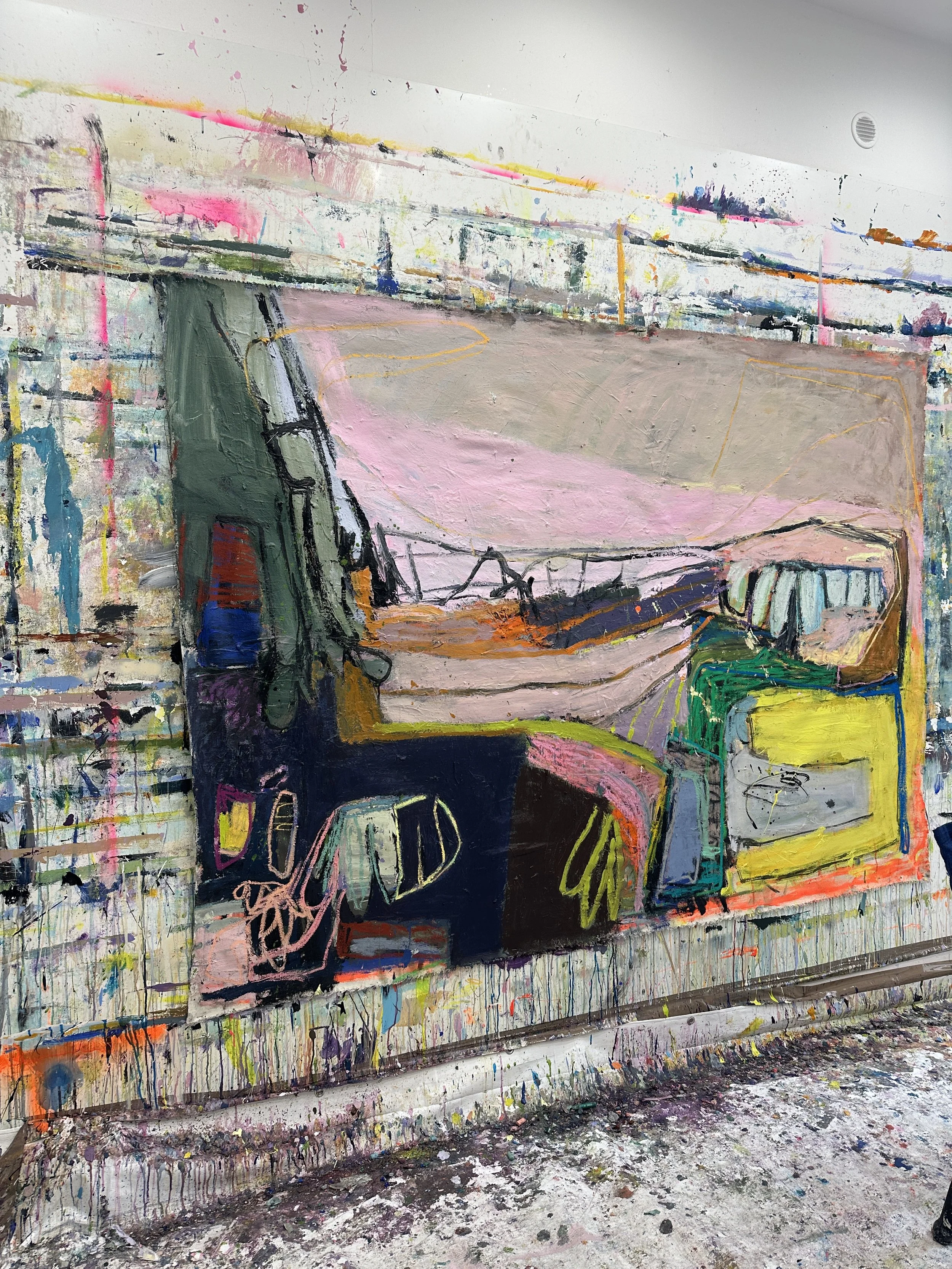 It is, on its surface, a savage image. But Cristine uses it as a framework for what happens inside a painting over time. This particular canvas, she tells me, was full of work she loved - passages of colour, marks, textures she had spent hundreds of euros and hundreds of hours building up. And then she “cannibalised” them. She painted over them, consumed them, let the painting eat itself in order to arrive at a composition that held together as a whole. The material is still there beneath the surface, still part of the thickness and the weight, but no longer visible.