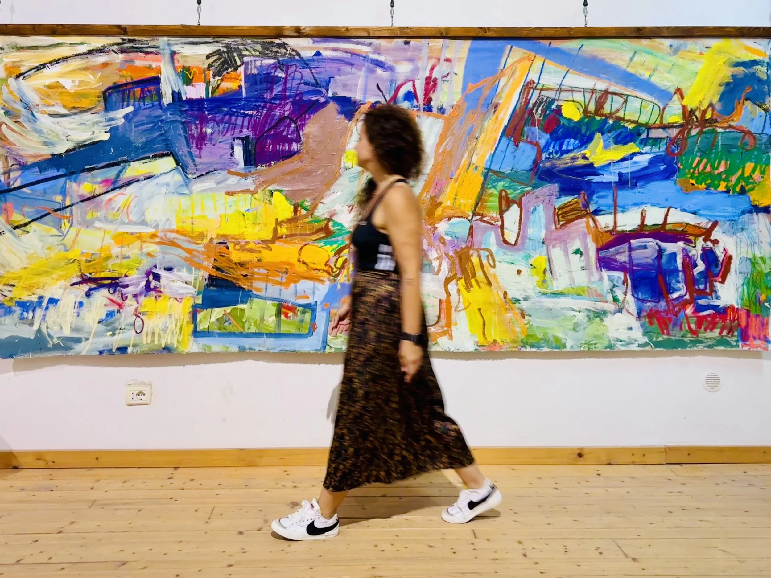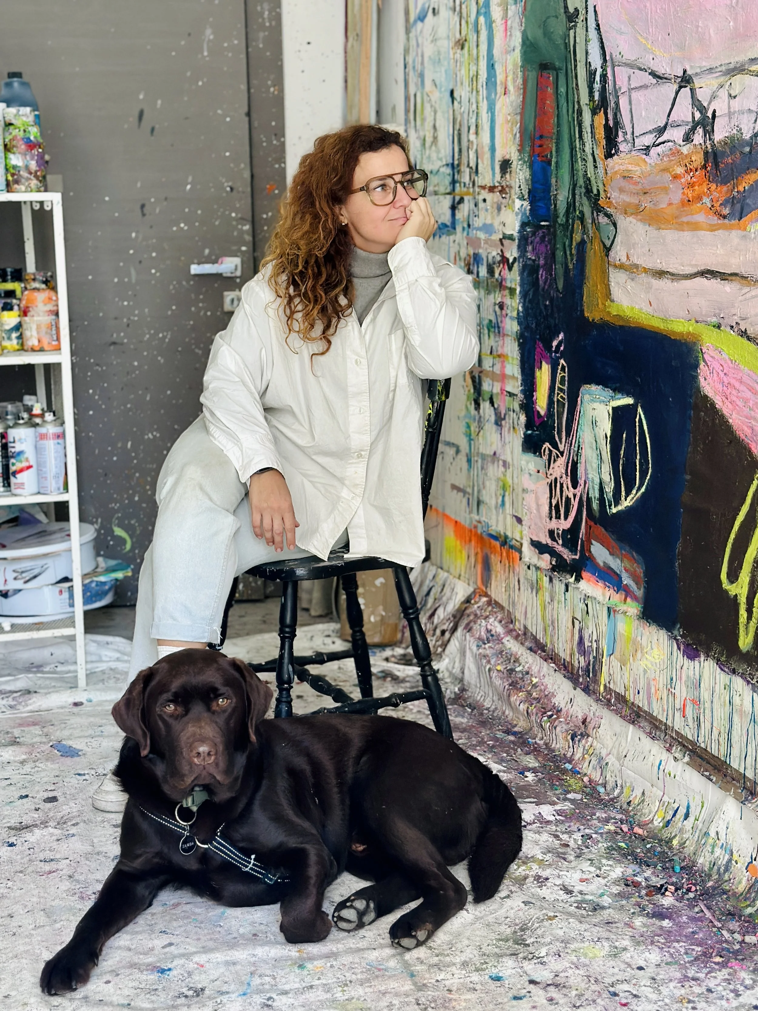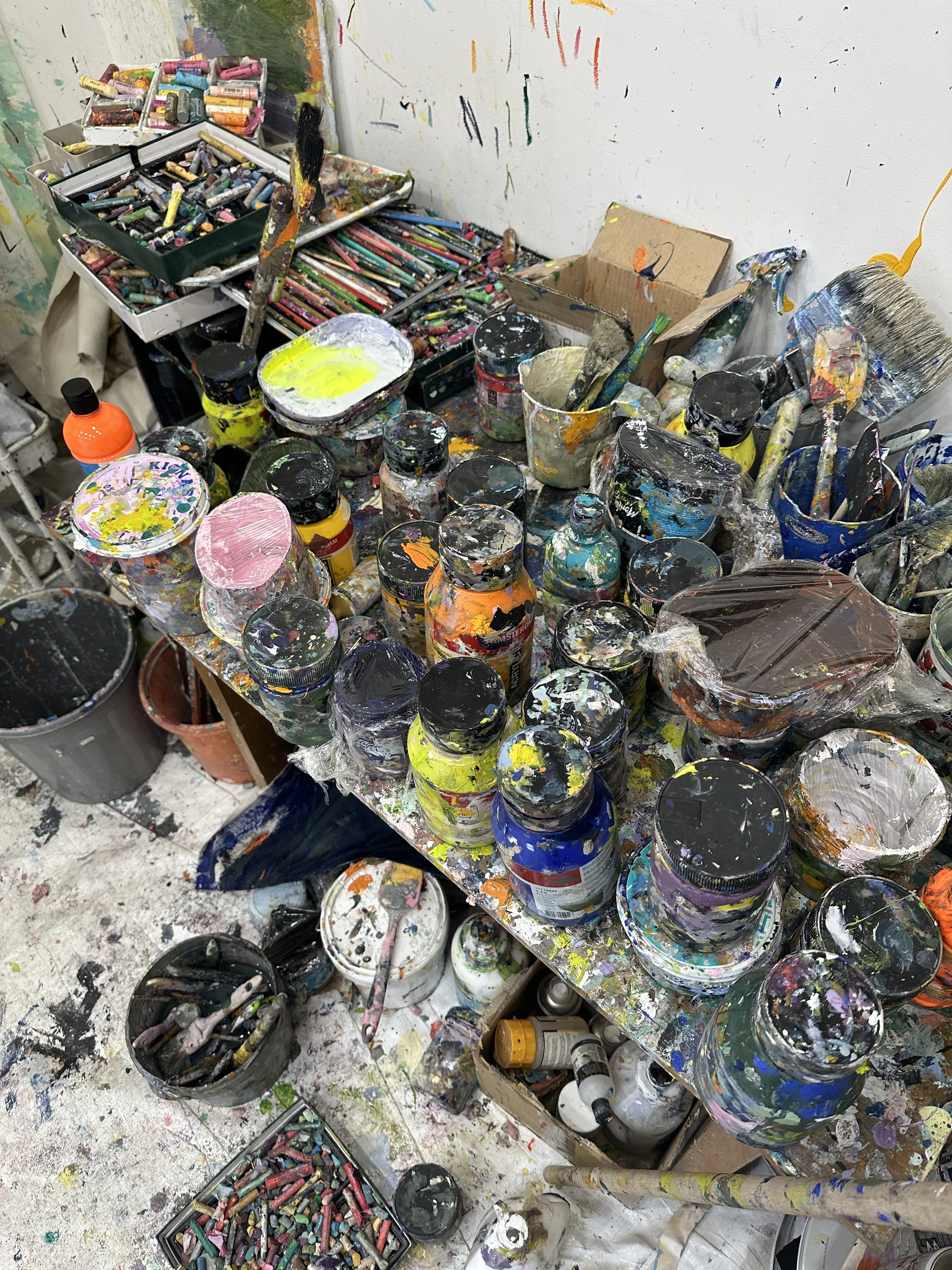 When I visit, there are canvases in various states of becoming, some drying while she battles with others, “gestures” she calls them - not paintings yet, but movements that will eventually feed the paintings. The studio feels less like a workspace and more like an ecosystem mid-process, which turns out to be the right metaphor for almost everything Cristine does.